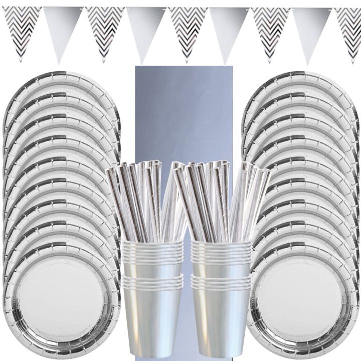 Silver Birthday Party Decor Disposable Tableware Set Rose Gold Paper Plates Banner Tablecloth Wedding Baby Shower Party Supplies