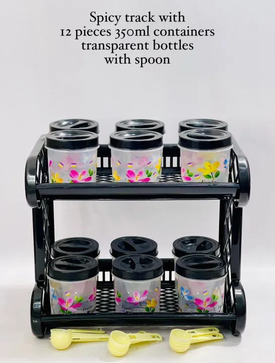 Spices Container 12 Pcs Flora Transparent Bottle Set with 2 Layer Multi Rack Good Quality & Multi-Purpose Kitchen Organizer
