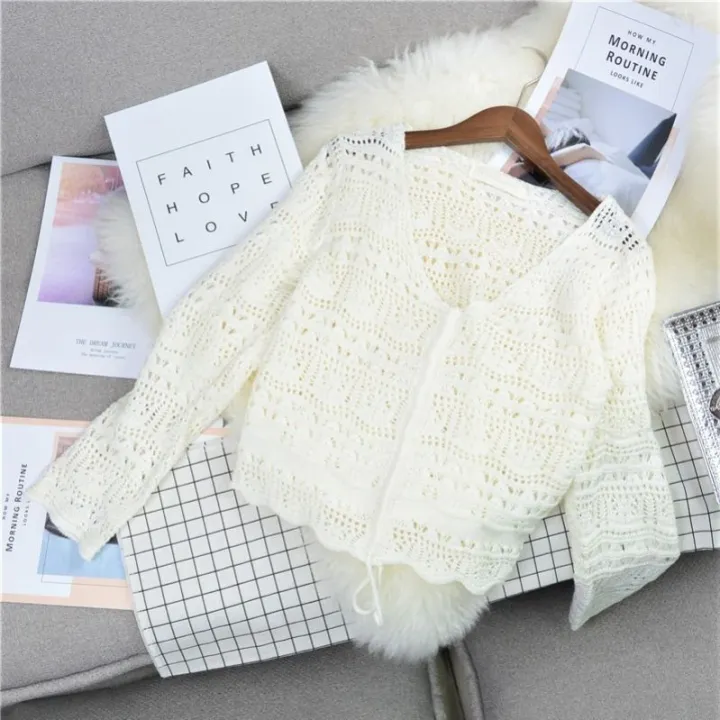 Spring and Summer New Hollow Sweater v Collar Short Loose Women's Long Sleeve Net Hole Top Drawstring Blouse Thin Sweater Women
