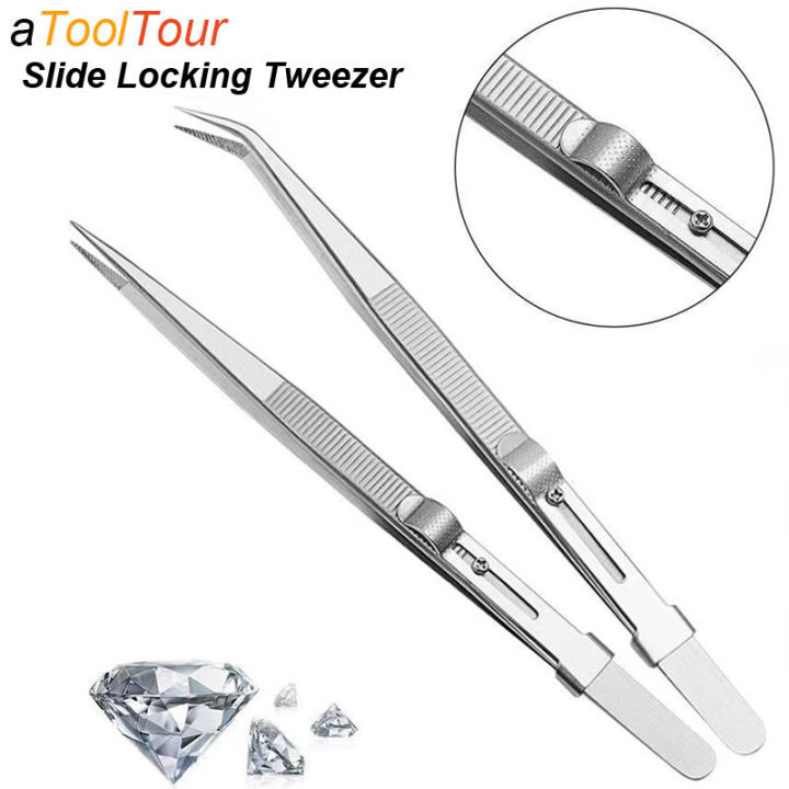 Stainless Steel Precision Tweezers Adjustable Slide Lock Antistatic Jewelry Eyebrow Craft For Electronic Component Repair Tools