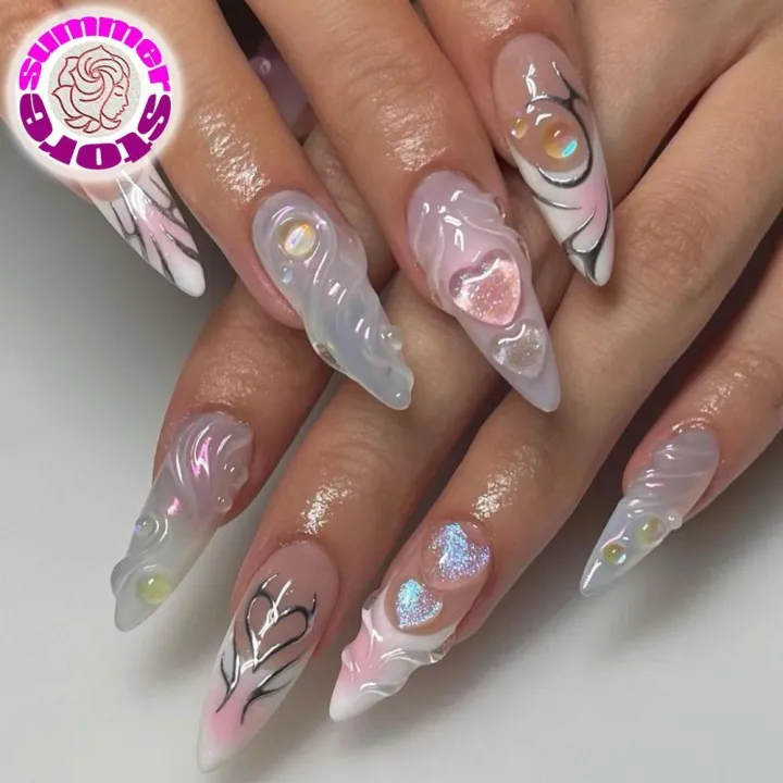 SUMMER Peach Love French Wear Nail 3D Type Fake Nails Mermaid Bubble Beads Nail Tips Finished Product