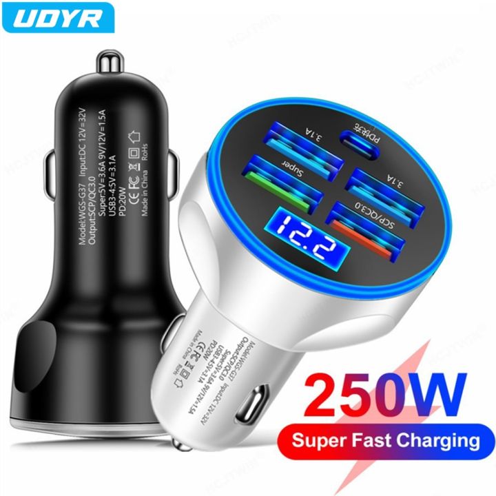Udry 250W Car Charger 5Ports Super Fast Charging Adapter Quick Charge 3.0 For iPhone 12 13 Xiaomi Note Samsung Huawei In Car