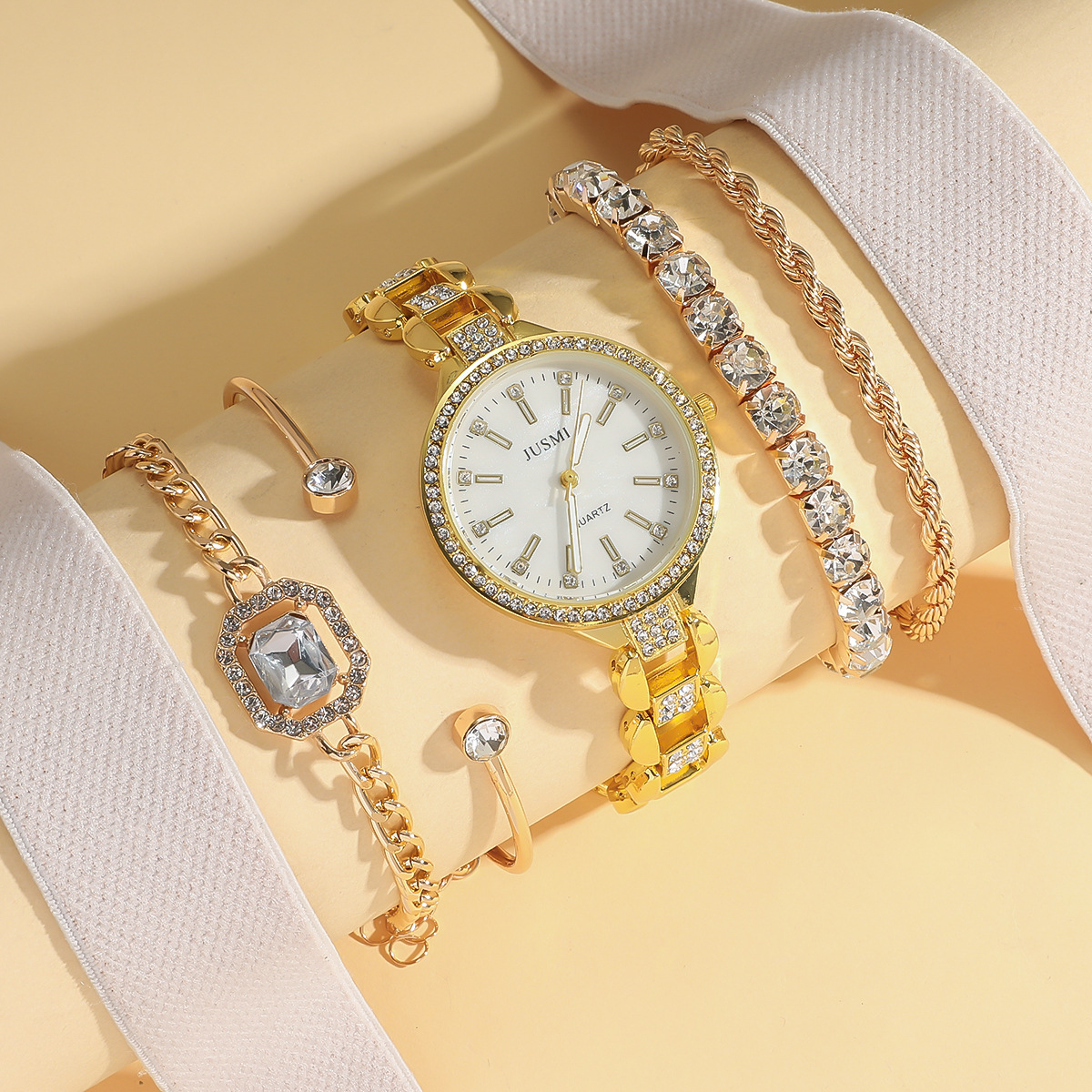【Unique features】JUSMI Luxe Gold Watch with Minimalist Dial, Paired with Sparkling Bracelet and Necklace Set - Light Luxury