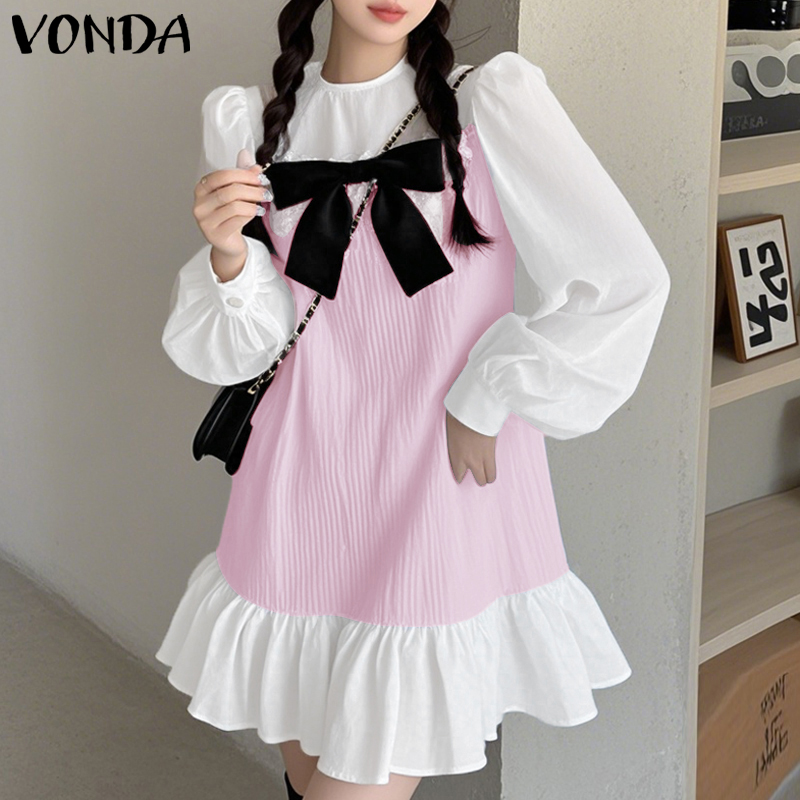 VONDA%20Women's%20Fashion%20Crew%20Neck%20Bowknot%20Contrast%20Dress%20Sweet%20Bubble%20Sleeve%20Ruffle%20Girlish%20Dresses%20(Korean%20Floral)%20-%20Image%205