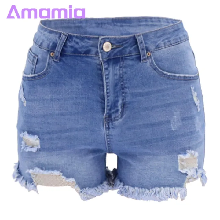Women Denim Shorts High Waist Denim Shorts for Women Ripped Edge Hollow Out Multi Pockets Slim Fit Jeans for Party Club Soft Breathable Fabric Women Summer Shorts