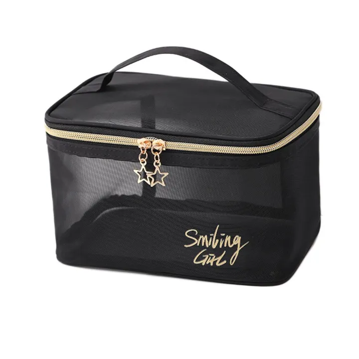 Women Girl Black Mesh Makeup Bag, Portable Travel Organiser Cosmetic Pouch Washing Lipstick Toiletries Sanitary Napkin Storage