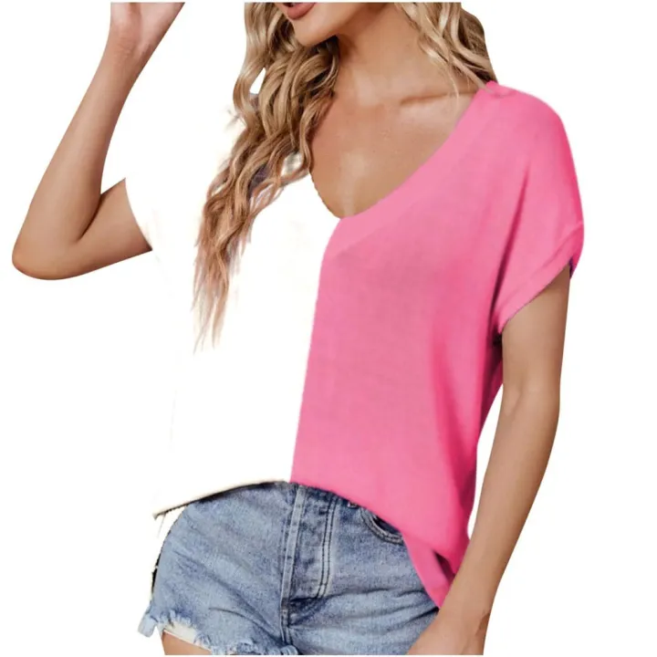 Women/%20Ladies%20/%20Girls%20Trending%20Single%20Jersey%20Cotton%20Fabric%20190%20Gsm%20Tops%20Half%20Sleeve%20V%20Neck%20Casual%20Loose%20Fit%20Office%20Wear%20Two%20Tone%20Selone%20Summer%20Crop%20Top%20T-Shirt%20/%20Tshirt/%20Blouse%20In%20Pink%20And%20White%20Color%20In%20S,%20M,%20L,%20Xl%20Sizes%20-%20Image%201