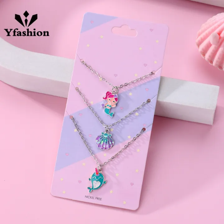 Yfashion 3pcs Girls Necklace Jewelry Cartoon Mermaid Shell Dolphin Shape Pendant Clavicle Chain Children Gifts