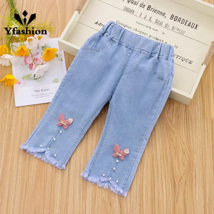 Yfashion Children Cotton Jeans Summer Thin Middle Waist Pants Casual Loose Cropped Pants For 2-8 Years Old Girls Cotton