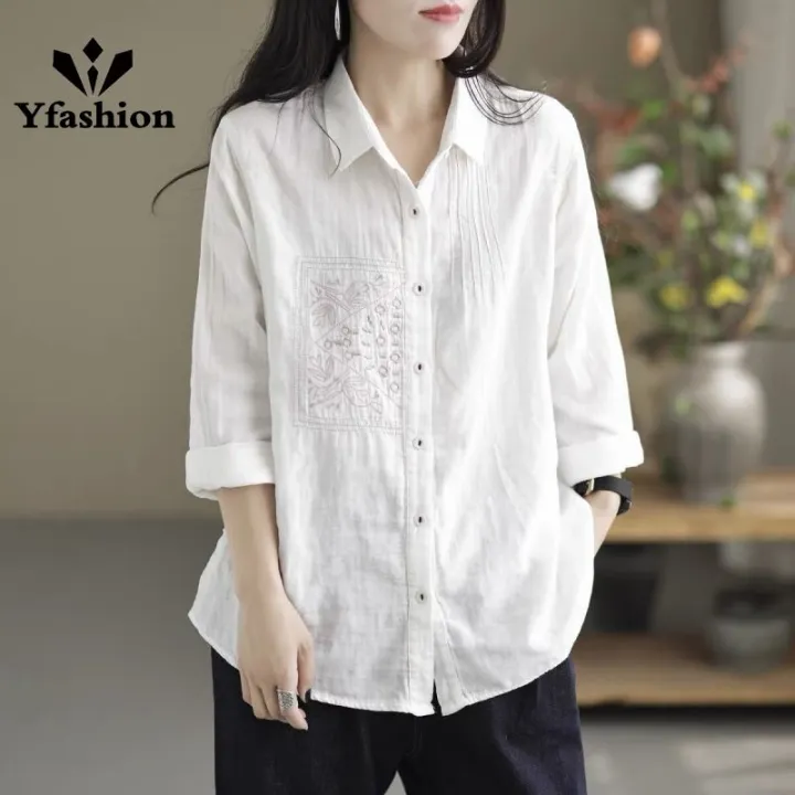 Yfashion Women Cotton Long Sleeves Blouse Trendy Retro Solid Color Embroidery Shirt Loose Single Breasted Cardigan Tops