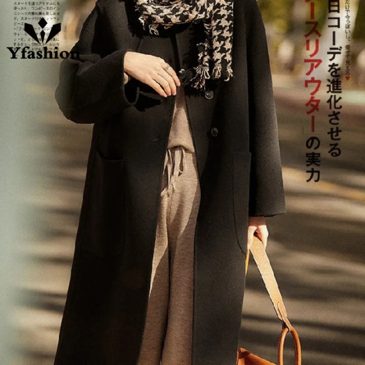 Yfashion%20Women%20Cotton%20Pea%20Coat%20Fashion%20Solid%20Color%20Long%20Sleeves%20Mid-length%20Wool%20Coat%20With%20Pockets%20Winter%20Loose%20Casual%20Jacket%20-%20Image%201