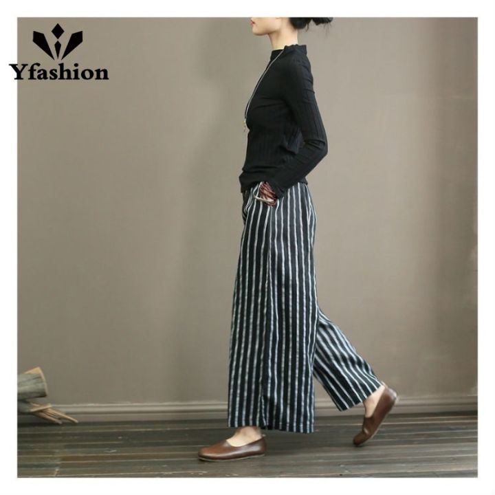 Yfashion Women Cotton Trendy Striped Wide Leg Pants Cotton Linen Loose Large Size Casual Trousers Straight Breathable Pants