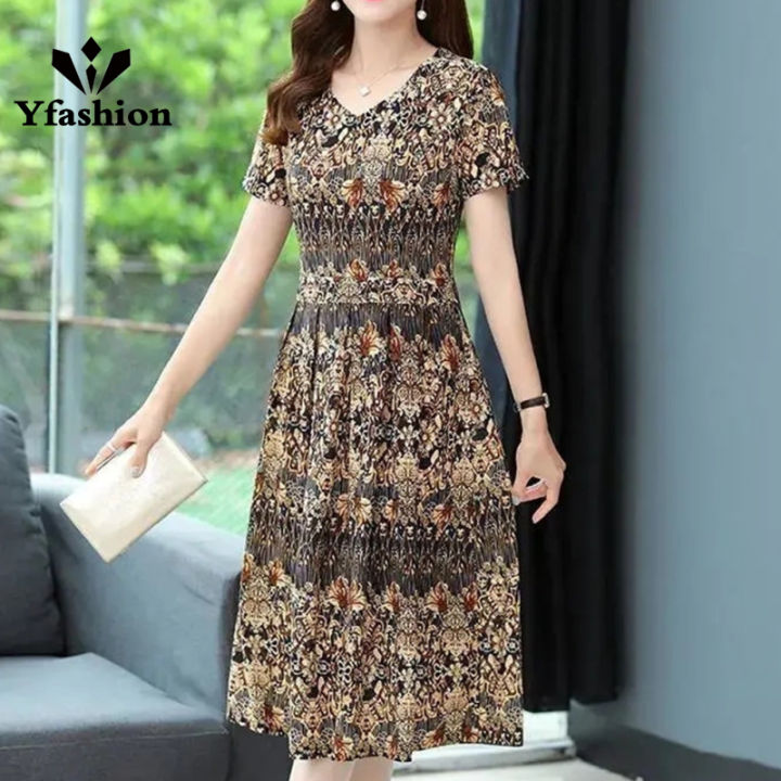 Yfashion%20Women%20Cotton%20V-neck%20Dress%20Summer%20Ice%20Silk%20Short%20Sleeves%20A-line%20Skirt%20Large%20Size%20Loose%20Casual%20Dress%20-%20Image%201
