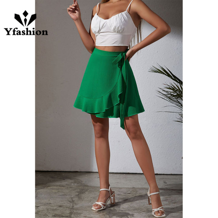 Yfashion Women Ruffle Skirt Summer Elegant High Waist Lace-up Simple Solid Color Short Skirt For Date Beach Party