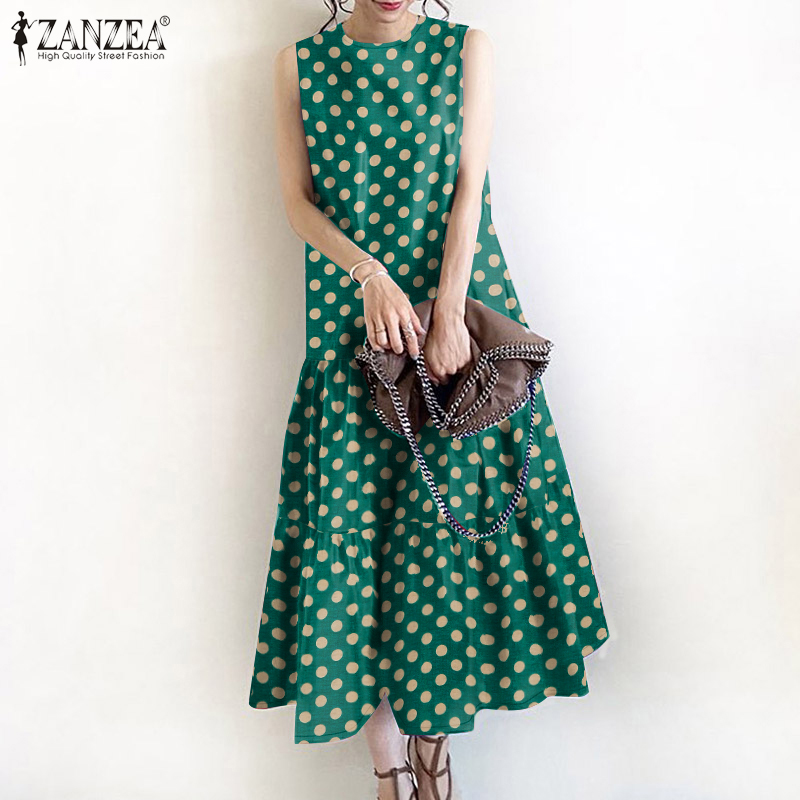 ZANZEA Korean Style Women Ladylike Polka Dot Midi Sundress Round Neck Loose A-Line Dresses