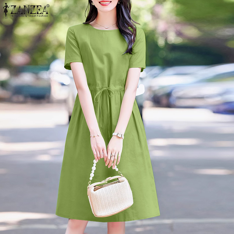 ZANZEA Korean Style Womens Casual O Neck Drawstring Lace Up Dress Elegant Short Sleeve Solid Knee Length Dresses