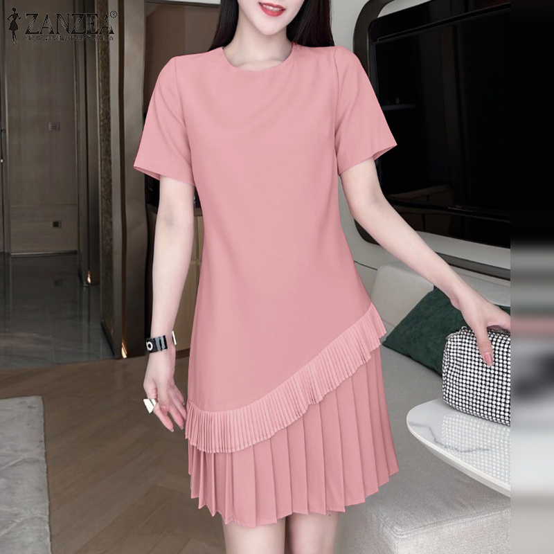 ZANZEA%20Korean%20Style%20Women's%20Dresses%20Commute%20Fashion%20Short%20Sleeve%20O%20Neck%20Patchwork%20Plain%20A-Line%20Dress%20-%20Image%201