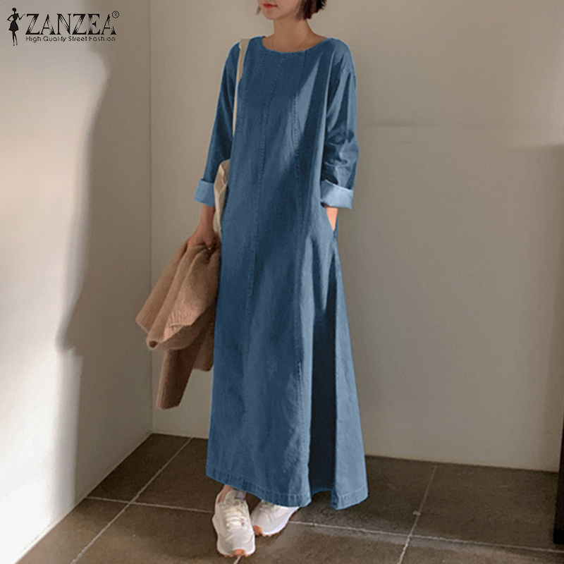ZANZEA Korean Style Women's Dresses New Fashion O-Neck Full Sleeve Buttons Plain Loose Denim Dress