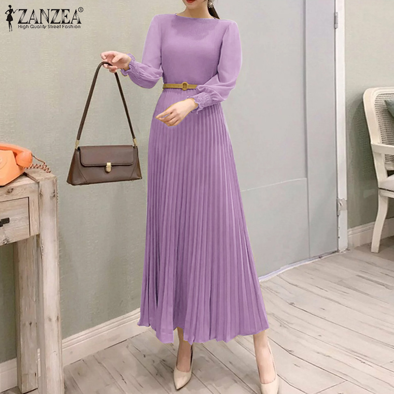 ZANZEA Korean Style Womens Elegant Crew Neck Lantern Sleeves Midi Dress OL Work Solid Pleats A-Line Dresses