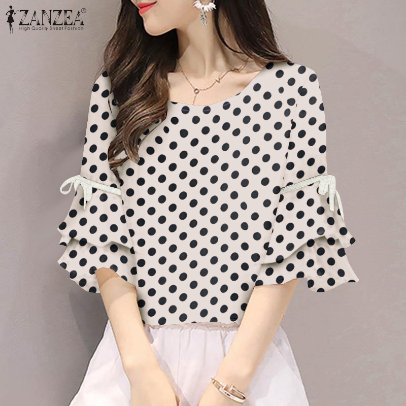 ZANZEA Korean Style Womens Elegant Ruffled Sleeve Polka Dots Blouses Ladylike Round Neck Lace Up Design Pullover