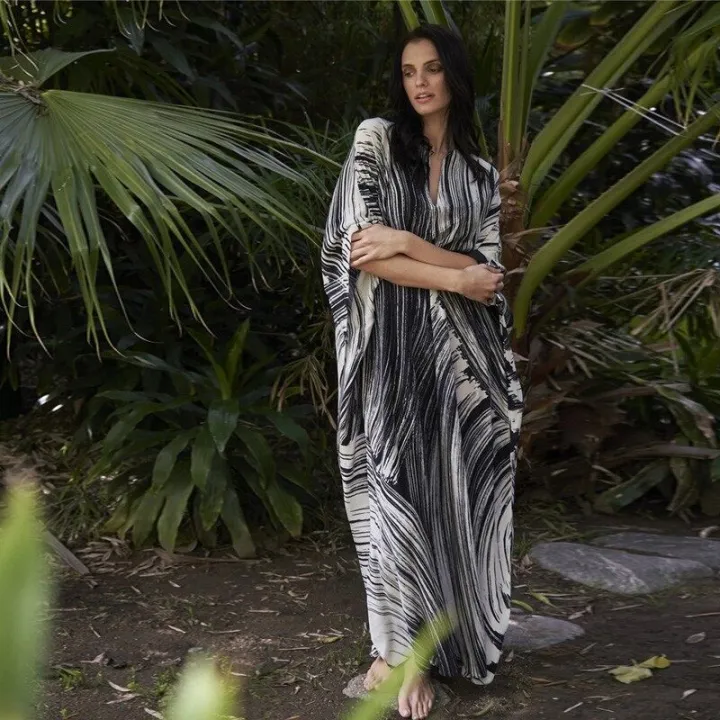 【ZIME】Zebra Print Maxi Dress With Belt Women's Black And White Stripes Print Waist Sash Long Kaftan Trendy Simple Style Elegant Gown Quick Drying Materials Swimsuits Beach Wear